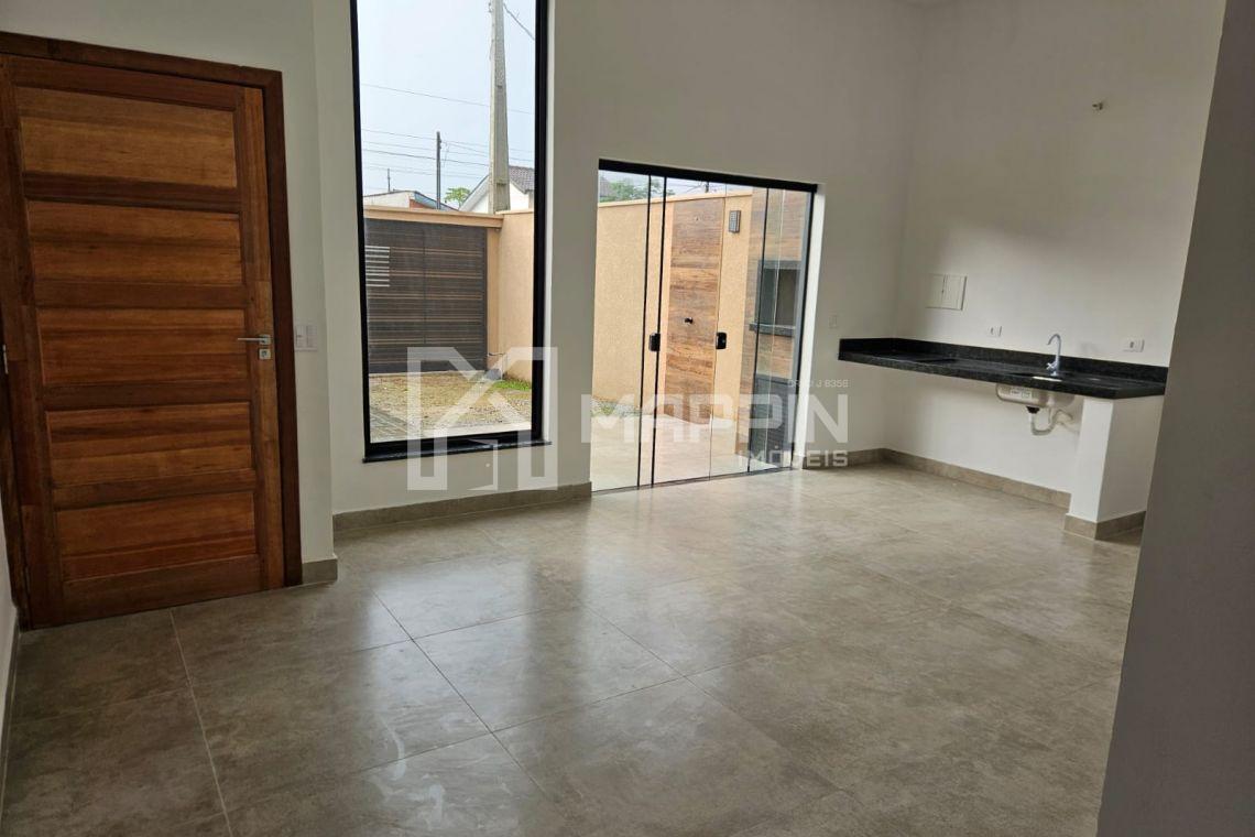 A casa possui ampla sala para dois ambientes (estar e jantar), integrada a uma cozinha em conceito americano, criando um ambiente moderno e funcional para o dia a dia.